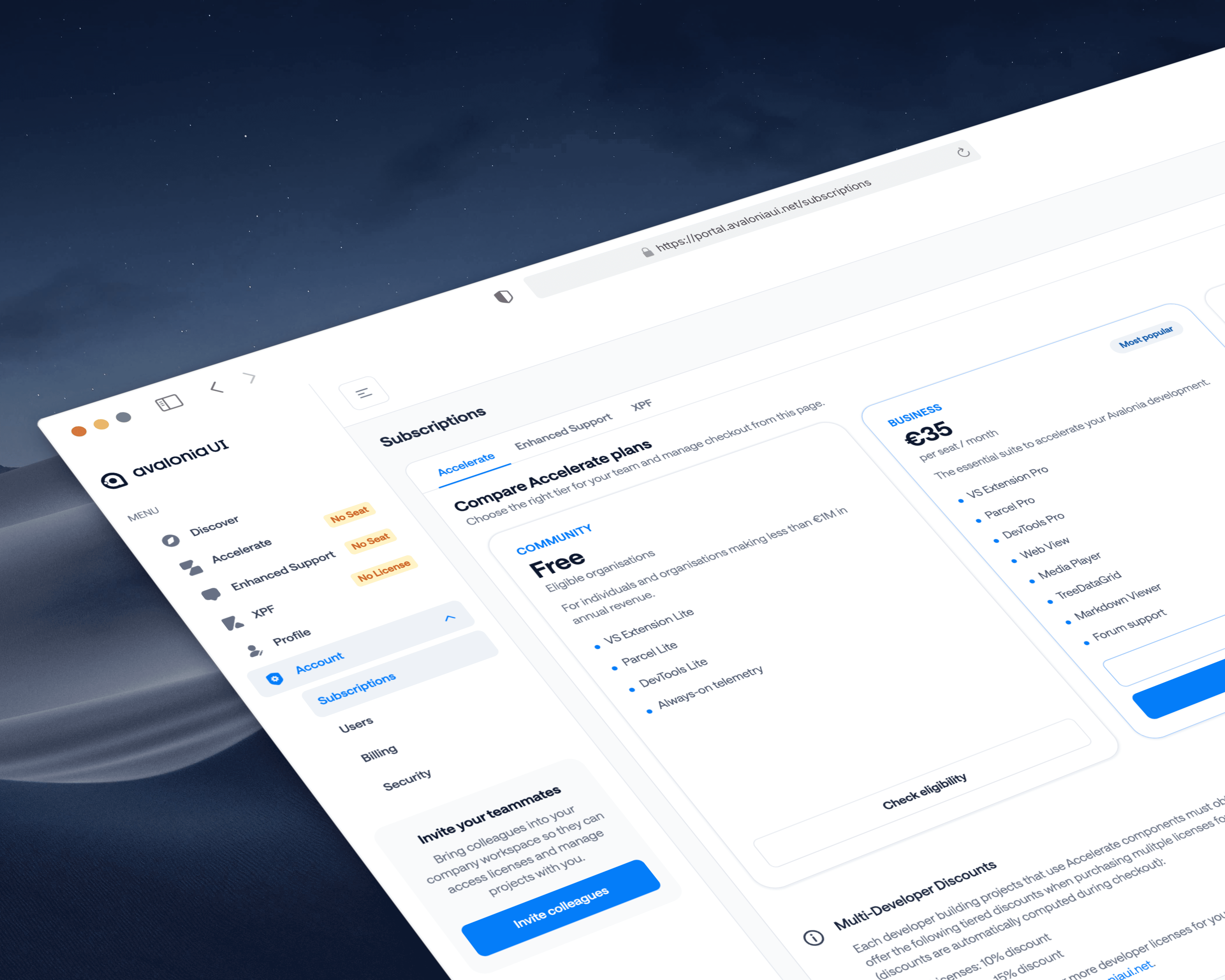 Alongside the new pricing, we’ve deployed a completely refreshed Avalonia portal. Managing your subscription is now significantly easier, with streamlined controls for billing and payments, plan changes, upgrades, and seat management.